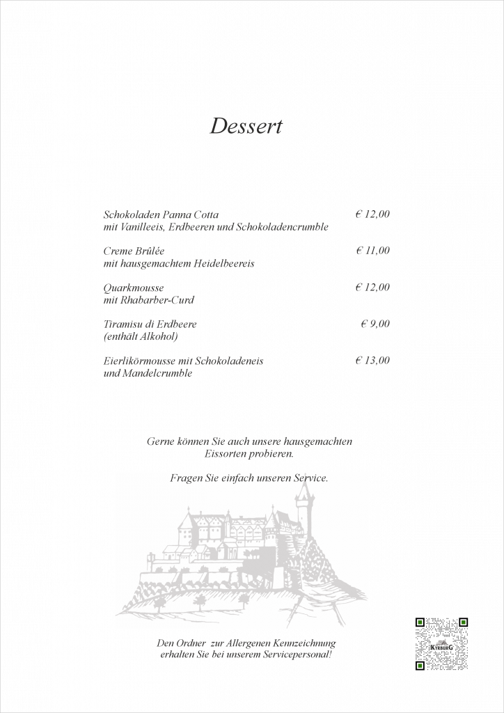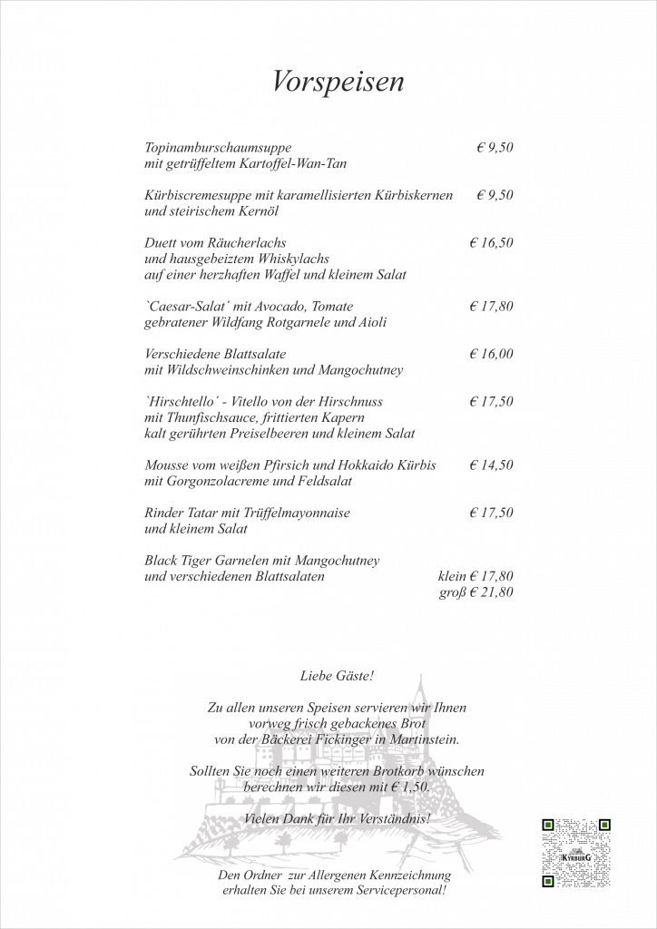 Da die Zutaten für unsere Speisen immer frisch sind, und um unseren Gästen auch Abwechslung und Vielseitigkeit zu bieten, variiert das Menü. Lassen Sie sich überraschen!